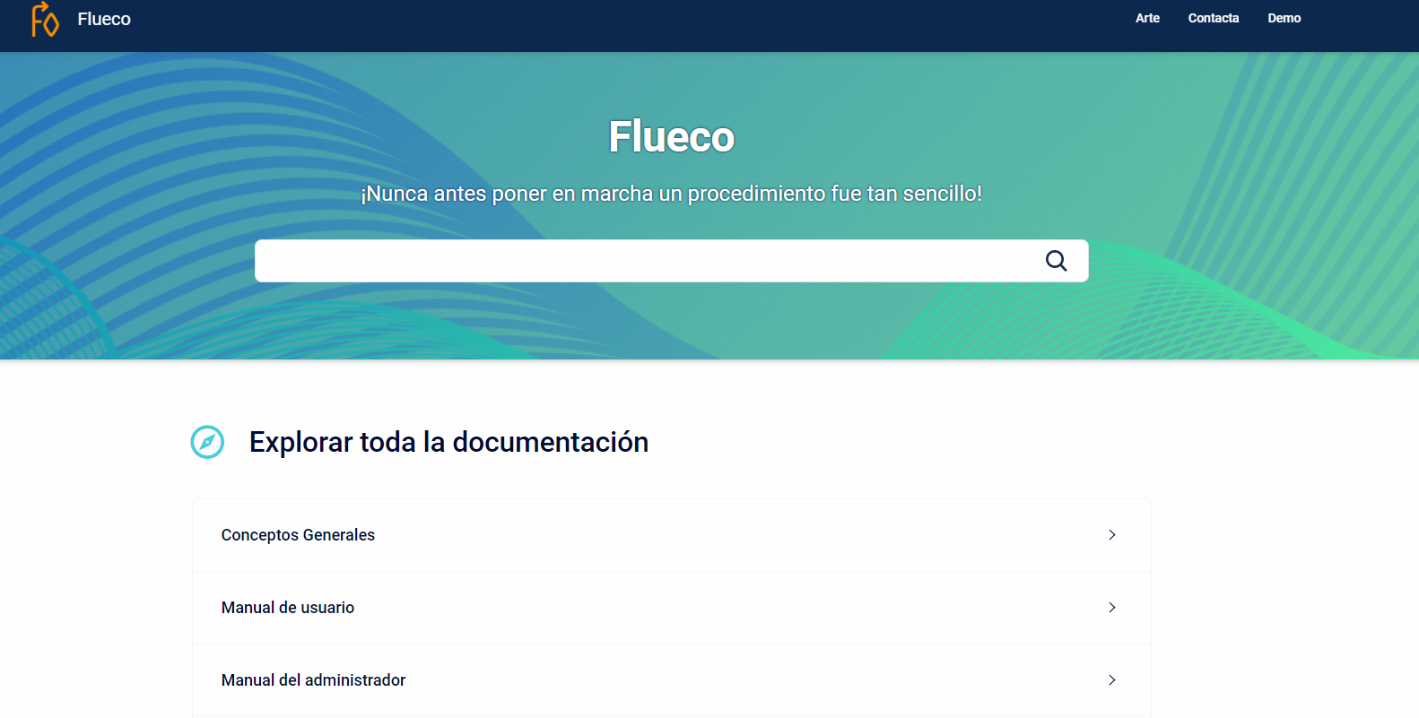 Es el enlace a la documentación en Flueco. Desde la página principal aparece el acceso a las novedades, manuales, tutoriales, versiones, etc.