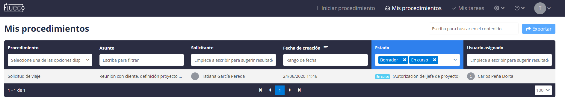 La distribución de las columnas nos permite ver simple vista, no solo la información básica del trámite, sino también el estado en el que se encuentra, incluyendo la tarea que está pendiente de aprobación dentro del procedimiento.
