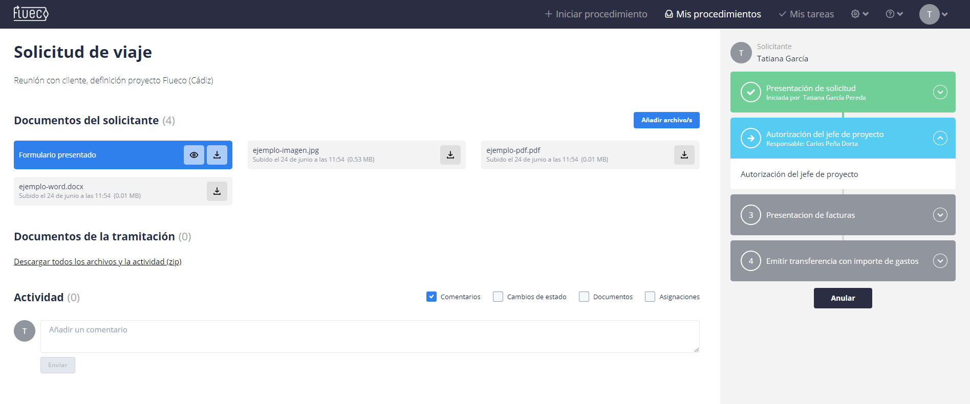 Al hacer clic sobre cualquiera de ellos, se nos abrirá la sección donde se refleja la información del procedimiento así como el flujo de tareas del mismo.